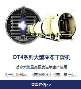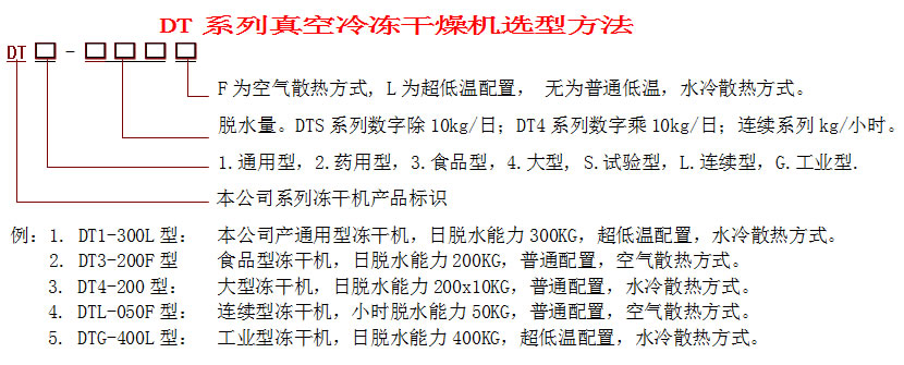 为方便用户选型,DT系列冷冻干燥机按不同干燥对象和不同用途划分为六个子系列,分别为DT1通用系列(一体机)、DT2药用系列(一体机)、DT3食品系列(分体机)、DT4大型系列(分体机)、DTL连续系列(无人一体机)和DTG工业系列。每个系列按脱水量分为6个规格型号,每个规格型号按制冷配置分普通型和超低温型,按壳体材质分碳钢型和不绣钢型,共约140多种规格型号可供选择。
